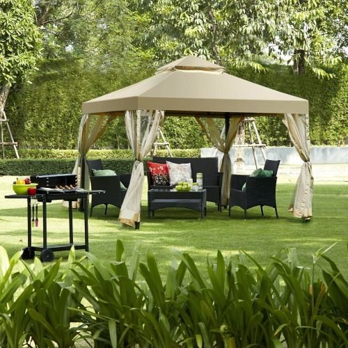 • 10 x 10 Ft Outdoor Gazebo with Tan Brown Polyester Canopy and Mesh Side Walls