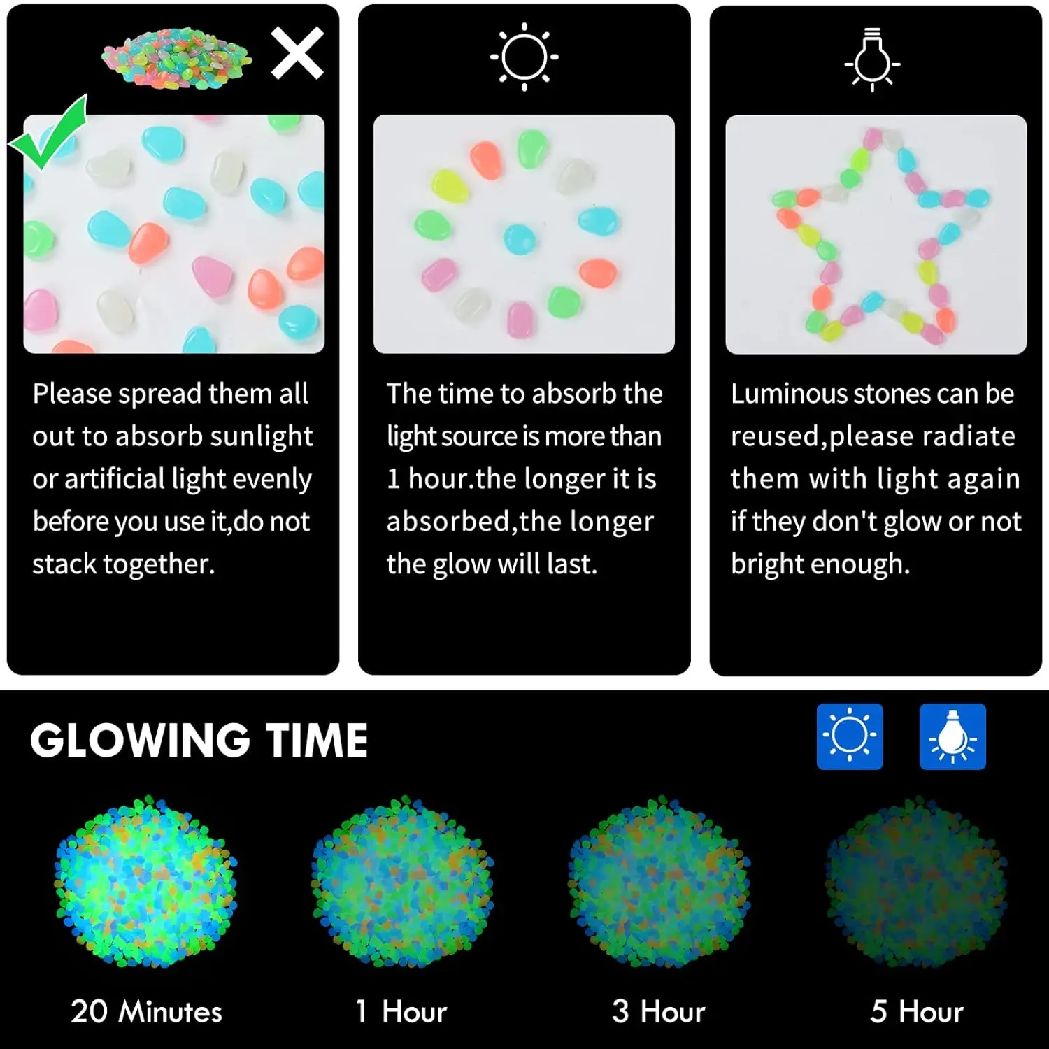 The glow in the dark stones will absorbs and stores sunlight or other light source, then they give off light in the darkness, with several hours of bright glow and then gradually dim away. The process will repeat for many years.
