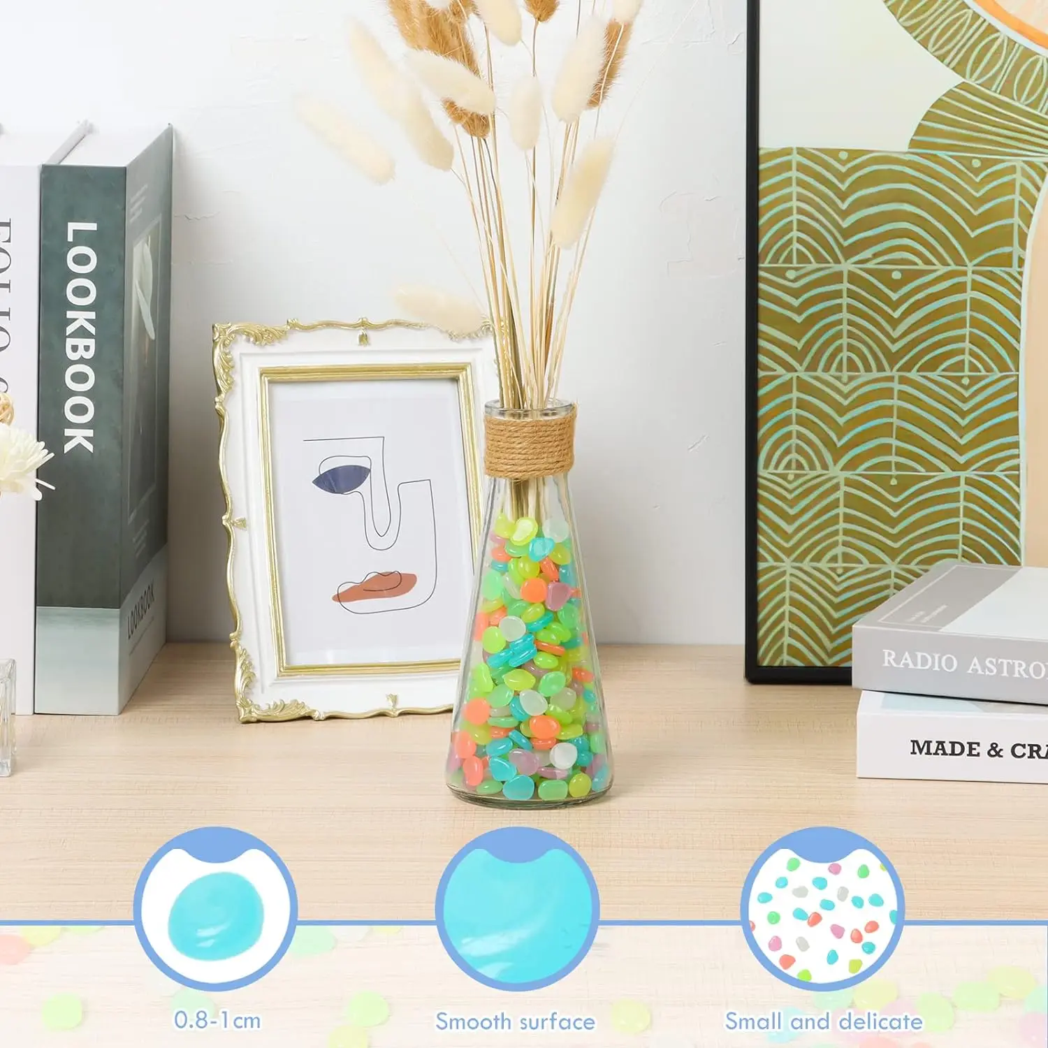 Glow stones pebbles are made of resin,the surface has been finely polished,smooth and round.the dimension of each decorative stone is 0.3″- 0.4″/0.8cm-1cm. perfect for home decoration,diy gift,night light,art & crafting,etc.