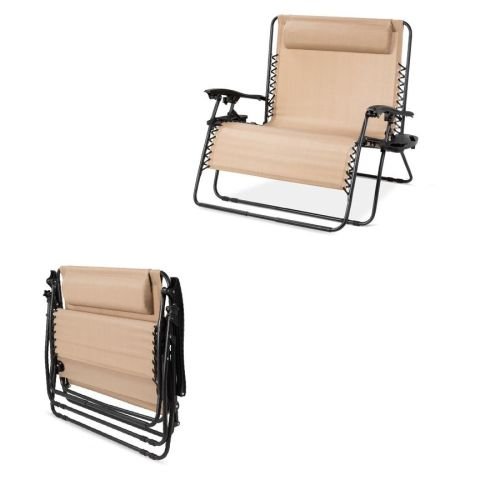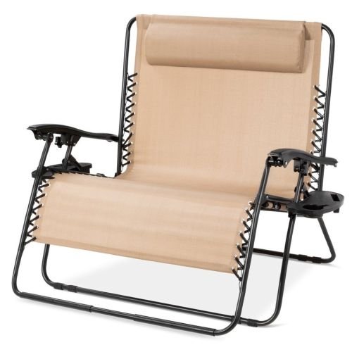 Come relax with a friend or loved one with the 2 Person Tan Extra Wide Zero Gravity Chair Lounger with Cup Holders Headrest! Built wide to seat 2 people. Recline 160 degrees and enjoy an adjustable, removable padded headrest for additional comfort. Foldable, lightweight chair design allows you to enjoy it anywhere at home, at the beach, outdoor sporting events, and more. Conveniently designed with a cup holder tray for drinks, magazines, phones/tablets, or other small items. Made of high-quality, weather-resistant mesh and an aluminum frame for optimal support, as well as replaceable elastic cords that make the chair immediately conform to the body.