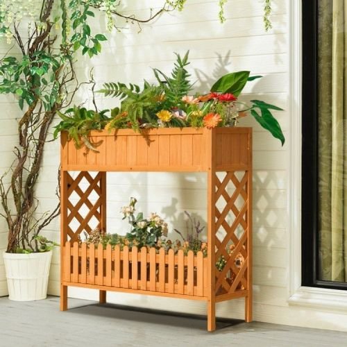 This FarmHome 2 Tier Raised Garden Bed Elevated Fir Wood Planter Box is crafted with 100% natural fir wood characterized by its high strength and excellent stability. Measures 37.5″ x 12.5″ x 35.5″ (L x W x H) and features 2 tiers (depth: 8″, 9″) to hold your plants, garden tools, pots, fertilizers, and soil bags as well as keeping your garden nice and tidy. Thanks to the elevated wood planter with 35.5″ height, users could easily plant, care for, and harvest plants without bending over and can hold up to 165 pounds.