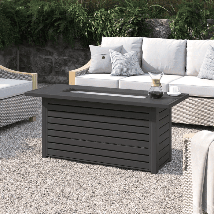 The fire pit table boasts a sleek and contemporary design, blending functionality with modern aesthetics. Its clean lines and minimalist profile make it a stylish addition to any patio or backyard setting, complementing a range of outdoor décor styles.