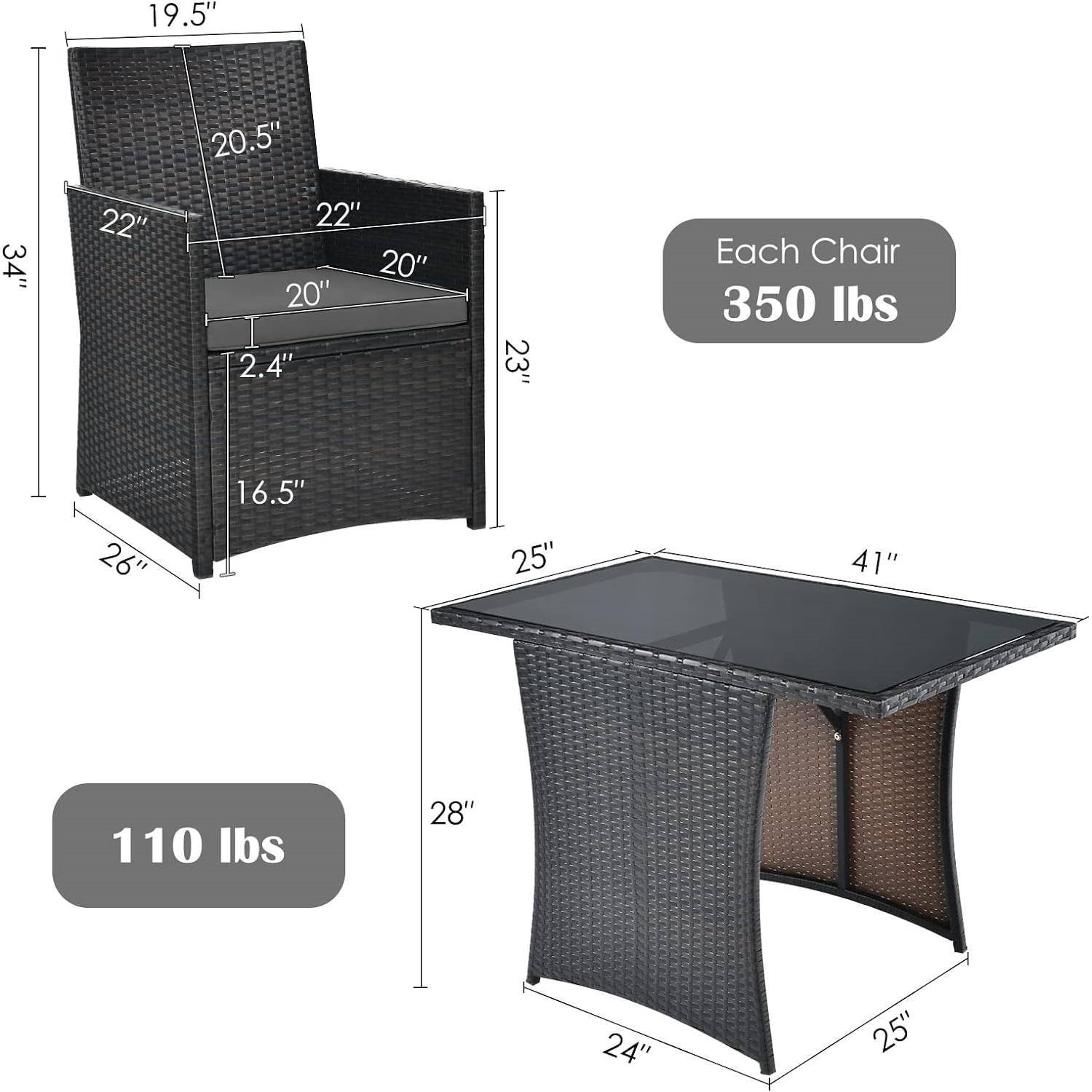 - Product Information: Dimension of each chair: 26” x 22” x 34” (L x W x H), dimension of table: 41” x 25” x 28” (L x W x H), seat height from the ground: 16.5”, weight capacity of each chair: 350 lbs, weight capacity of table: 110 lbs.