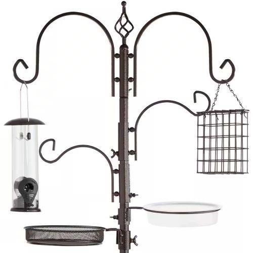 This Complete Bird Feeder Set with Bronze Metal Stand Suet Water Bowl Tube and Tray comes complete with four feeders: a wire feeder, peanut feeder, tube feeder, and suet feeder, as well as a water bowl and additional food tray. The durable hooks are excellent hangers for feeders as well as wind chimes, birdhouses, and other decor. Threaded tubes come together while a set of wingnuts secure additional hooks or feeder stations before staking the pole into the ground. Made entirely of durable steel, this feeding station features a long anchor to withstand the wind and allow feathery friends to stop by for years to come. At 89 inches tall, this feeder station will help attract dozens of birds and improve your gardening experience.
