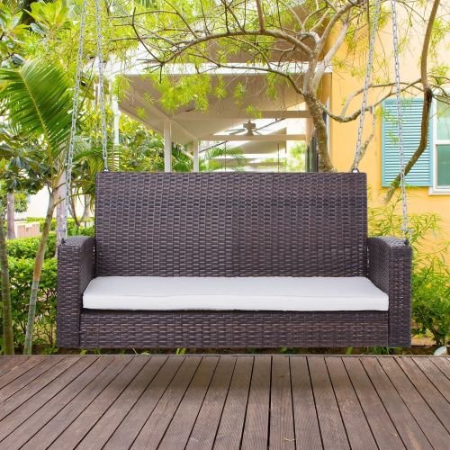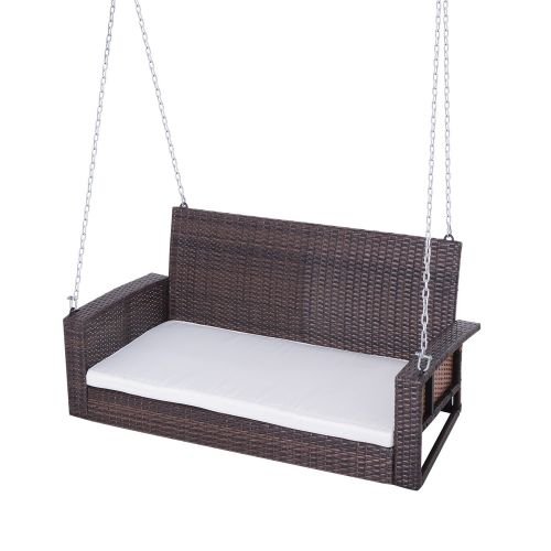 Espresso Wicker Porch Swing 7ft Hanging Chain with Cream Padded Cushion