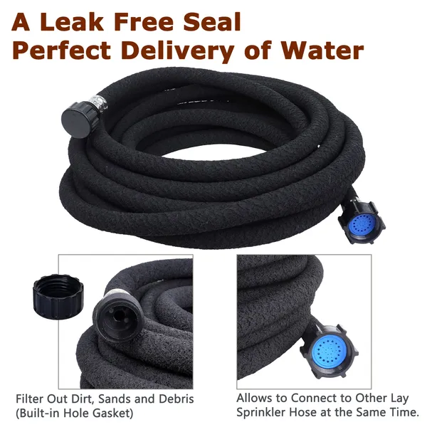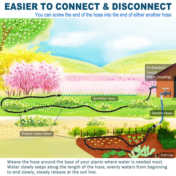 Flexible: Quick attach reinforced fittings are included and make for easy connect of additional soaker hoses and easy to unroll and stake in garden; flower bed; ground cover or other landscaped areas.