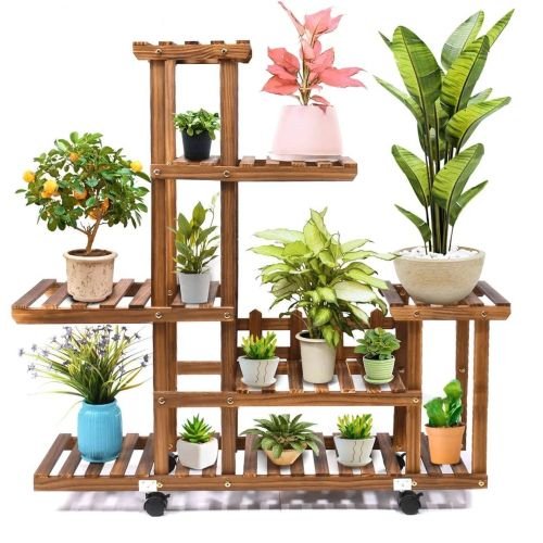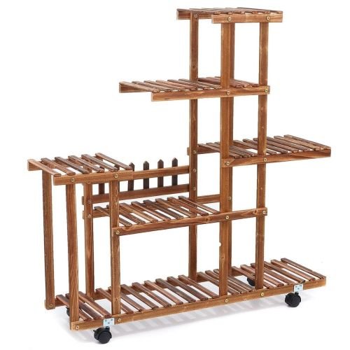 - Indoor Outdoor Solid Wood 6-Tier Plant Stand Planter Cart on Wheels
