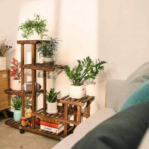 This Indoor Outdoor Solid Wood 6-Tier Plant Stand Planter Cart on Wheels has multipurpose wooden plant shelf with wheels and is not only a plants shelf rack, but also a bookshelf, display shelf, decorative stand, it fits for different occasions like balcony, patio, living room, garden etc. Heavy Duty Frame Construction. With the slanting stick reinforced on the base shelf and stainless steel screws which are lengthened that fix the plant stand sturdy and hold the plants steady. Lockable Wheels. Wheels with 360 degree rotation moving and locking design, can be attached on the base of this wood plant stand shelf. Saves your time and energy when you want to move the pots from the plant or do the cleaning job. Wooden Texture. The surface of the wooden shelf was polished many times, There is no burr anymore with a smooth touch that won’t hurt your fingers when you water.