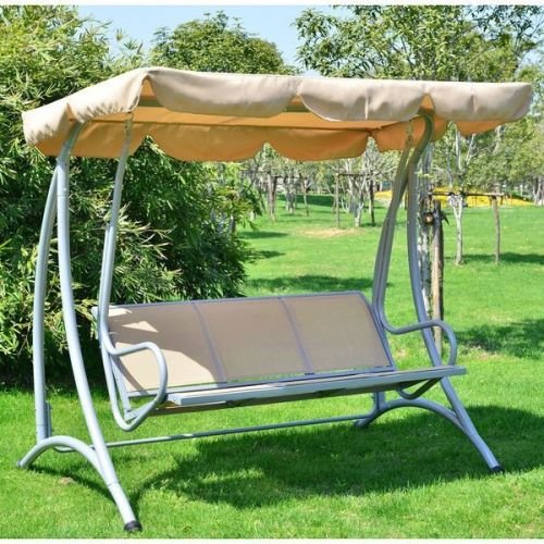Enjoy the beautiful weather with your friends by relaxing on this Sturdy 3-Person Outdoor Patio Porch Canopy Swing in Sand Color. Have a seat on this comfortable swing chair and let the breeze gently sway you back and forth. The frame is made of durable powder coated steel with a water resistant polyester canopy for extra shade. The seats are curved for an incredibly comfortable seating angle complete with arm rests on each side of the swing. Sit back, relax , grab your favorite drink and let the breeze take you in this stylish backyard swing chair.