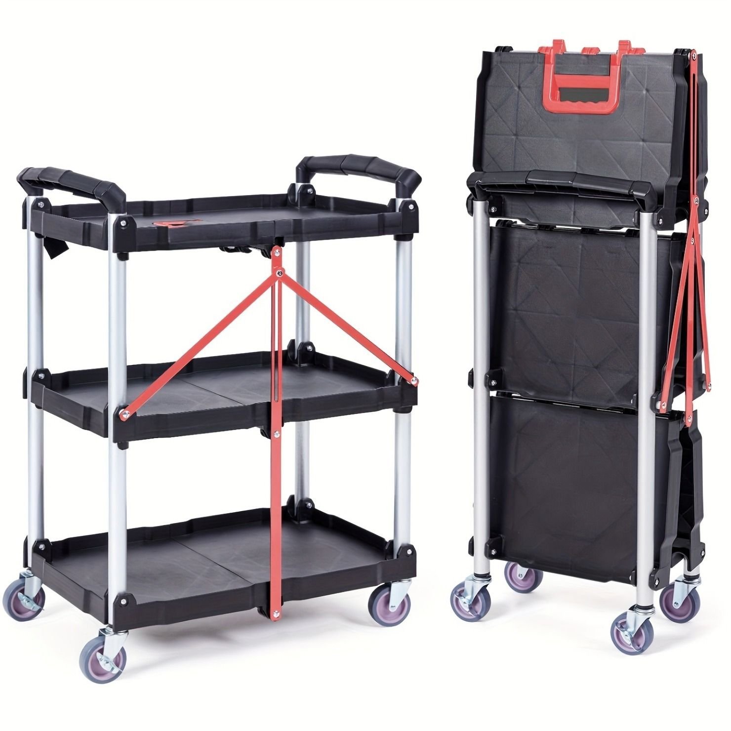 Versatile 3-Tier Foldable Cart with Locking Wheels – Portable 3-Tier Work Cart with 4 Wheels (2 Lockable), Ideal for Home/Office/Warehouse,165 LBS Heavy-Duty Plastic Rolling Cart